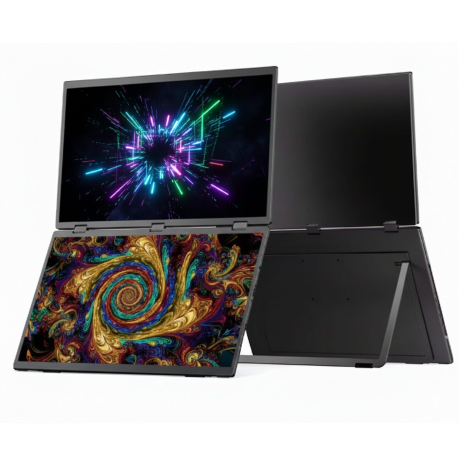 Con dos pantallas de 18.5 pulgadas apiladas verticalmente, el Nomadify Doble te permite visualizar flujos de trabajo complejos sin interrupciones. Imagina tener tu software de edición de video en la pantalla superior y toda la línea de tiempo en la inferior, o monitorizar mercados financieros mientras redactas informes. El formato 16:9 dual te otorga una perspectiva que ningún otro monitor portátil puede igualar.